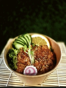 Tuńczyk w panko, ryż, sezonowe warzywa i owoce