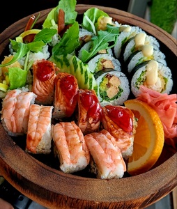 🥢6x futomak tofu wędzone, rukola 🥢6x futomak sandacz w panko, sos limonkowy 🥢4x california łosoś, żurawina, tykwa w tempurze 🥢4x california krewetka, tykwa w tempurze