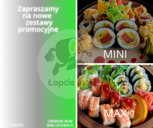 6x Futomak tuńczyk w tempurze 6x Futomak łosoś 6x Futomak pasta z tuńczyka 8xUramak pasta z maślanej 8x California tuńczyk, papryka w tempurze 8x California łosoś, tamago 2x Gunkan maki tatar z łososia 2x Gunkan maki sałatka krabowa